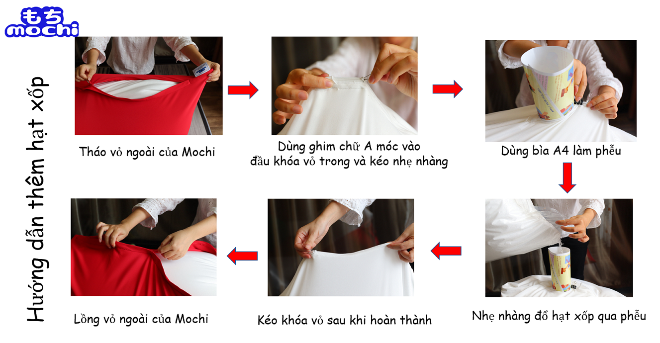 Trong quá trình sử dụng, hạt xốp sẽ thoái hóa tự nhiên, bị biến dạng và không trở về hình dạng ban đầu, do đó, cảm giác chiếc ghế sẽ bị “thấp” đi, vải rộng hơn, không có cảm giác thoái mái nâng đỡ khi sử dụng. Lúc đó, bạn chỉ cần bổ sung hạt xốp để đảm bảo chiếc ghế của mình lại sử dụng tốt như mới. Sản phẩm của Mochi mochi sử dụng hạt xốp siêu nhỏ kích thước chỉ từ 0.5-1mm, do đó mật độ phân bổ của hạt xốp khá đồng đều, hạt xốp rất khó bị biến dạng, nếu có thì rất ít. Thông thường sau một thời gian sử dụng, tùy vào mức độ của mỗi người thì khoảng 6 tháng đến một năm bạn nên kiểm tra và thêm hạt xốp. Chỉ cần 0.5-1kg xốp bạn có thể làm mới lại chiếc ghế của mình. Chúng tôi gửi bạn hướng dẫn thêm hạt xốp đơn giản, các bạn chú ý khi thao tác thêm hạt xốp nên tránh nơi có gió, kể cả gió điều hòa nhé, dễ dàng làm hạt xốp bị bay ra nhà. Khi thao tác xong nên dùng máy hút bụi để vệ sinh sàn nhà, hút hết hạt xốp vương vãi.